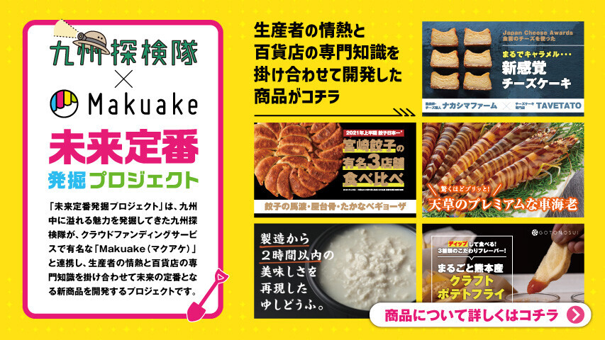 2021年10月 博多大丸主催の未来定番発掘プロジェクトにおいて、博多大丸様と弊社で共同開発した【クラフトポテトフライ】のクラウドファンディングプロジェクトが、大丸店舗内のボードに掲載されました。