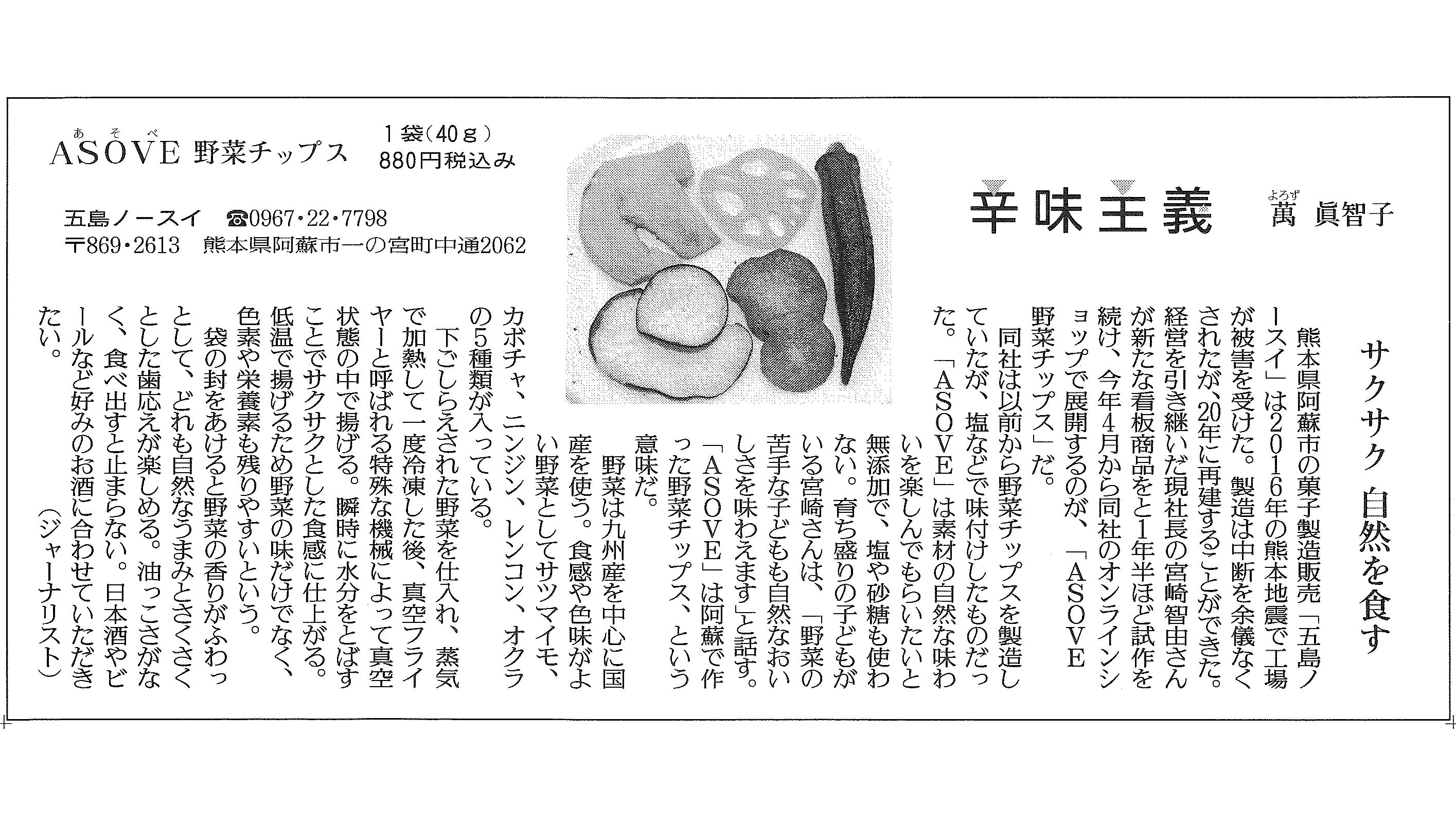 2021年8月28日 読売新聞夕刊(都市圏版)の人気コラム「辛味主義」にて、ASOVE野菜チップスを紹介していただきました。